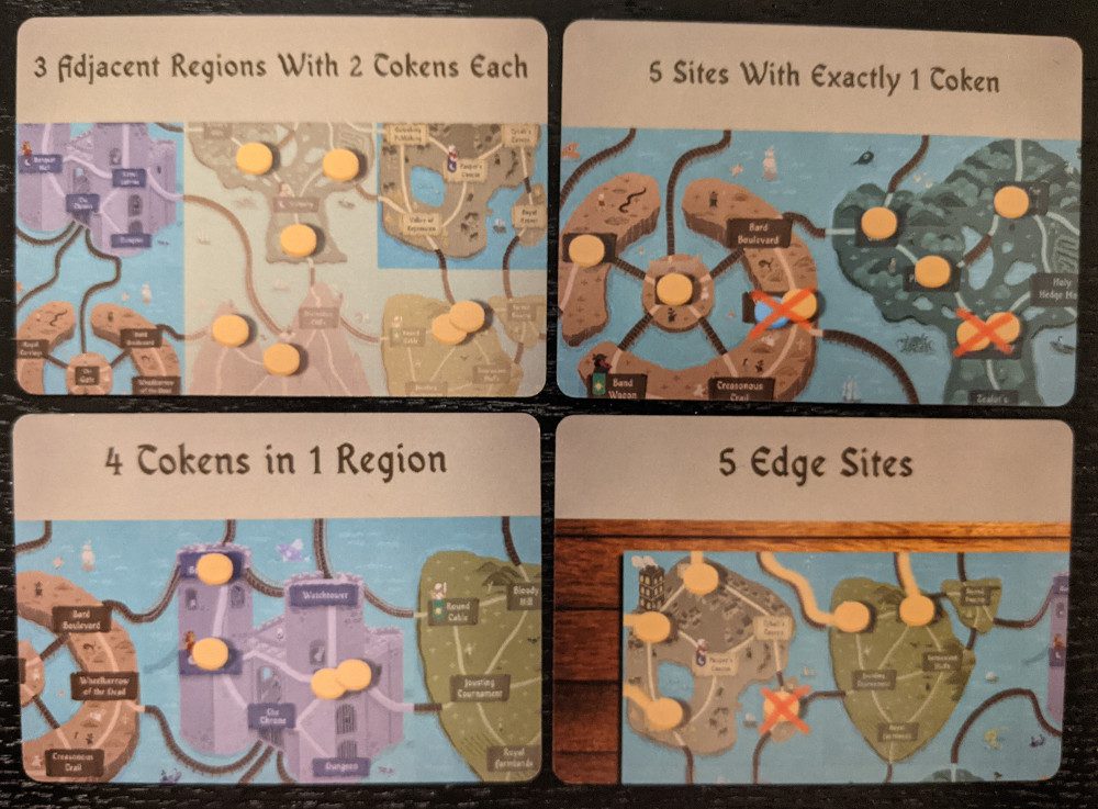 Since the Four Humours is based on medicine, that means doctors, and you are a doctor with ambitions. You want to be the most famous throughout the land, and that means traveling to several locations to rub shoulders with nobles, peasants, bards, knights, and witches. There are four goal cards in each game, and your job is to fulfill as many goal cards as you can, but the game will end when someone has achieved two goals. These goal cards are all related to the map, such as “occupy 6 regions” or “5 sites with exactly 1 token.”
