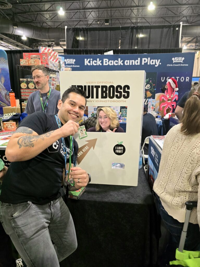 At PAX Unplugged, Dan Cassaro and the Weast Coast team shared a booth with Chris Couch Games, which definitely upped their presence on the floor. You could hardly walk by without noticing it—one side was fully Christmas-themed, and there was even a little photo booth with Dani Strandring drawing caricatures.