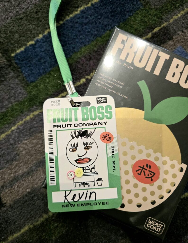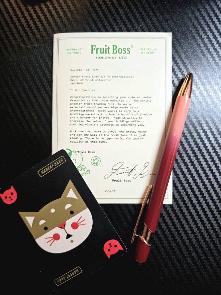 With a snappy 20-minute play time, easy-to-learn rules, and fun retro art, I recommend it for casual game nights, as a palate cleanser between heavier games, or as a friendly gateway for non-gamers. Fruit Boss is a fruitful time wheeling and dealing.