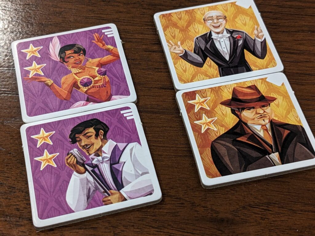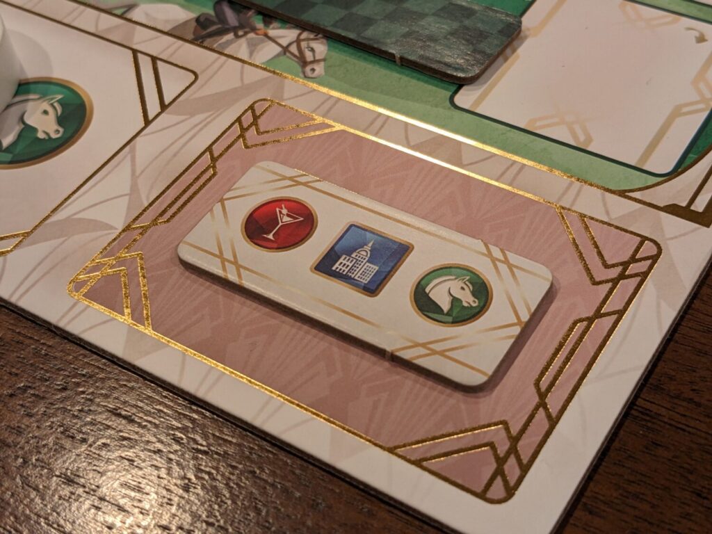 I loved that, and I loved that it feels like you are always one move away from ending the game on your own terms before someone else snakes the game away. On the flipside, I have enjoyed the Racetrack and the Financial Center areas more than the Cabaret…the Cabaret only has three Character tiles, so it’s a tricky place to invest heavily early on. (Of course, all the one-time bonuses you can find in that area make it required reading when considering the other two areas of the board.) The back-and-forth at the Racetrack is fun, while the tracks in the Financial Center always require a sideeye; setting up an opponent behind on the track to move forward two spaces to steal a character was a popular move in each of my plays.