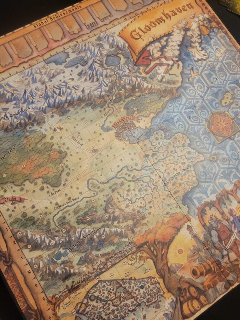 Gloomhaven is a cooperative fantasy dungeon crawler. The flow of the game is straightforward. You start with an opening scenario where you go beat some guys up for money, and then you return to the city to spend your loot before choosing another scenario where you go beat some more people up. In the city, you have a random event where you make a “choose (a) or (b)” type of choice that’s read off a card, and you have a similar event when you’re on the “road” to the scenario you’re about to undertake. As the game continues, you’ll find yourself having different choices for which scenarios to explore, and sometimes you’ll get random ones (I found myself going to stop a lava ritual at one point).