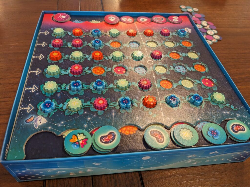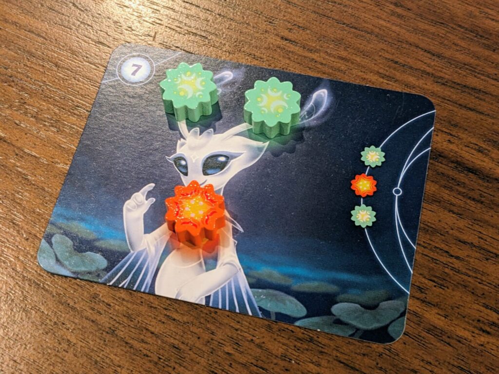 Turns go like this until about half the board is full of flowers. Then there’s a very quick scoring round that rewards players who played lots of the same types of flower cards a little more than anyone else, along with points for stardust tokens, which happen to look a lot like cute jellybean counters. Players reform a personal draw deck made of their previously-played flower cards, which is then used for the rest of the game to take matching flowers from the board. At the end of the game, order cards make up a sizable portion of a player’s point total, along with points for stardust and scraps for any leftover “little helper” tokens that were used during play to slightly augment each turn.