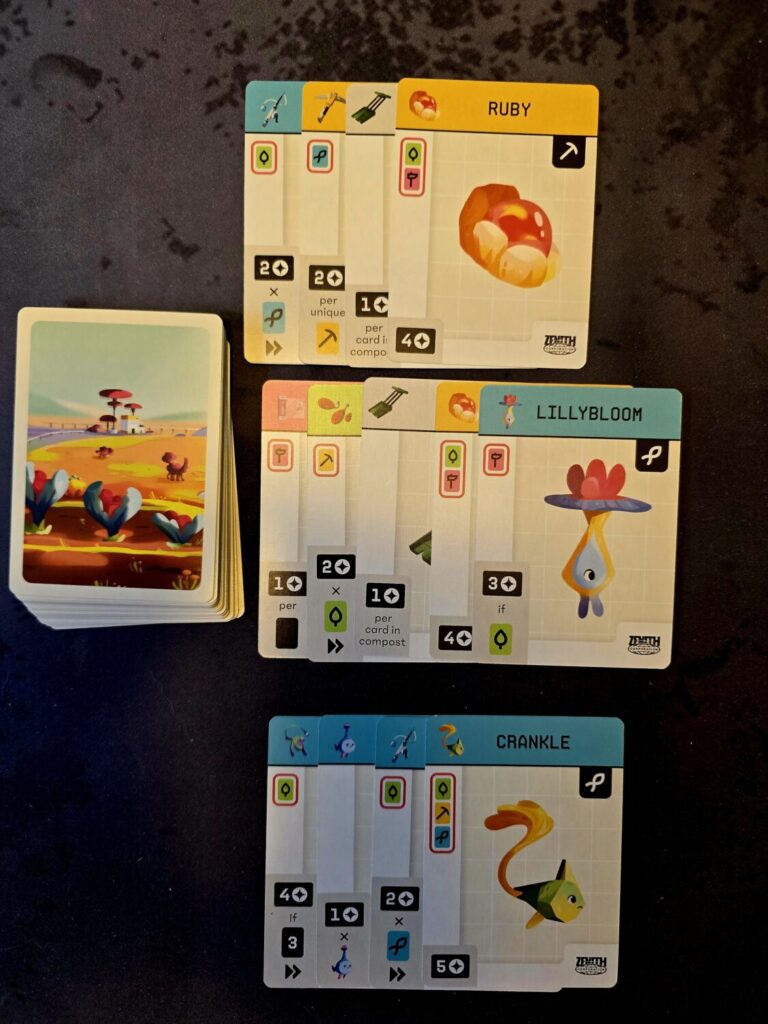 When a player decides to ship their line of cards, they must play one additional card to complete the sequence. Then a new line is started, locking in the previous one for endgame scoring. If a player cannot legally place a card in their line, they “bust,” dumping all cards from that line into the compost, which scores one point per card at the end. Players can also claim an achievement on their turn if their line meets the criteria listed.