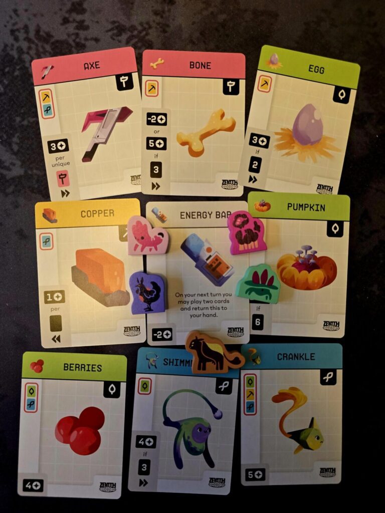 I liked the addition of item cards, which often score negative points but grant powerful actions that add some mitigation. Some of the iconography trips things up a bit—while the graphic design is clear, the explanations of a few scoring symbols aren’t fully fleshed out and can lead to confusion. Otherwise, the game is solid. It’s approachable enough to introduce to non-gamers, yet has enough depth to play strategically. Though the game leans more luck-based than not, it’s a nice filler for those who enjoy drafting with a bit of added risk on every card played. It plays great at any player count and has the kind of solid foundation that’s easy to recommend.