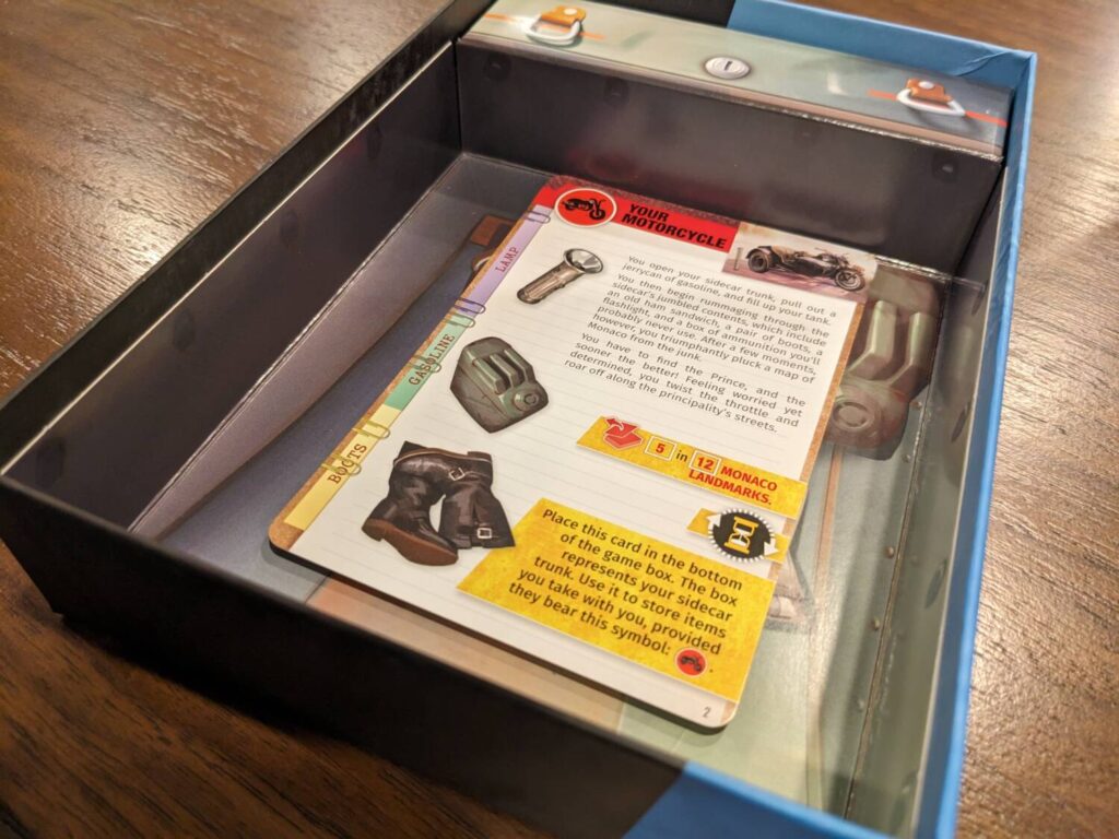 Many one-shot games take about an hour, maybe 90 minutes, and actually penalize players for taking longer than that. Guilty: Monaco 1955 goes in the opposite direction and states it right on the box: you will need 3-4 hours to solve the riddle here, and the instructions remind you that you won’t even get to all the story and time cards used to socialize evidence in that amount of time.