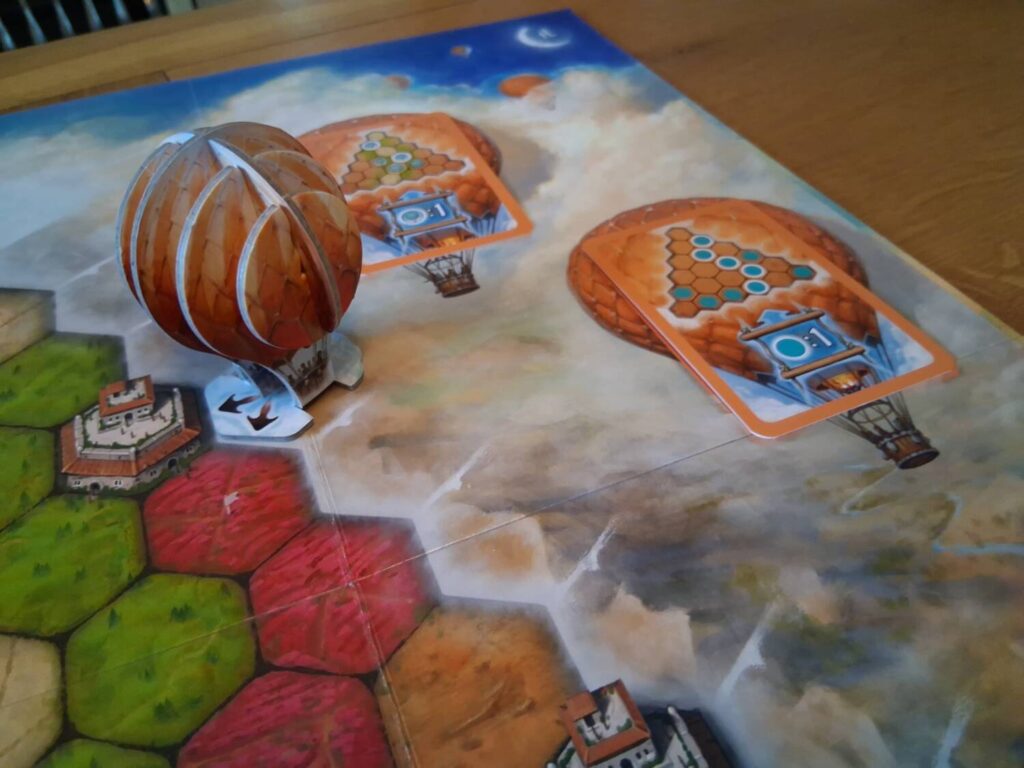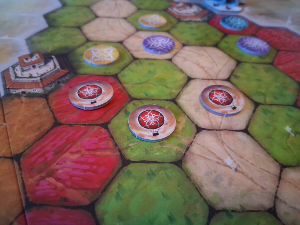Tear two is a major flaw but, in truth, it’s minor: the die. At the start of each turn you roll a standard six-sided die and move the wonderfully large cardboard hot air balloon around the edge of the triangular board. The lines of sight where it stops are where you can place your balloon that turn. Initially this feels overly restrictive. In my first game I started creating a group in one area and then spent the rest of the game unable to do much with it thanks to unhelpful rolls of the die.