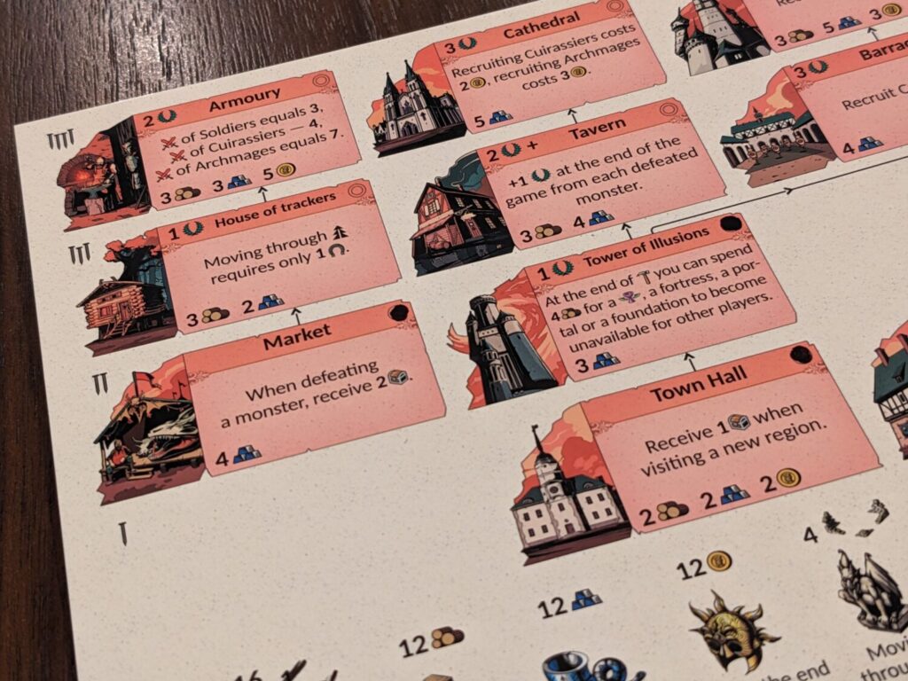 Each player’s faction sheet is exceptionally scoped to include everything a player needs. There’s a resource tracker, a big map, a host of buildings, a scorepad, and a round tracker all packed into a sheet that’s a little taller than a standard sheet of US letter-sized, dry-erase plastic. It’s efficient, and the overall package is so efficient that I think the box is somehow too large for what’s included (four markers, six faction boards, four player aids, and a rulebook).