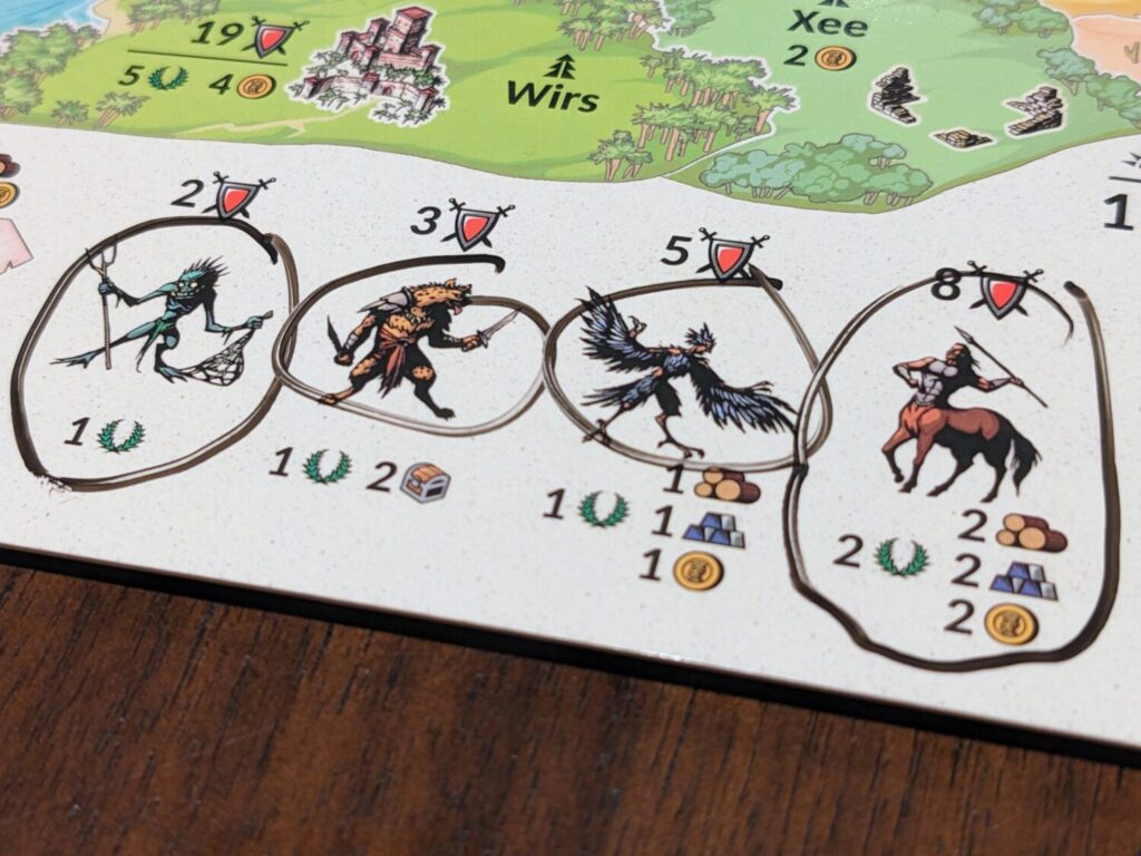 I did my first play of the game with my nine-year-old son. He picked up the rules very quickly, and by turn four or five, we were humming. That play took about 40 minutes, but my son and I never ran into each other. We mostly spent time hoarding resources, building up our armies, and taking out minor monsters that are available to cross off the bottom of a player’s mat by spending the appropriate amounts of military units.