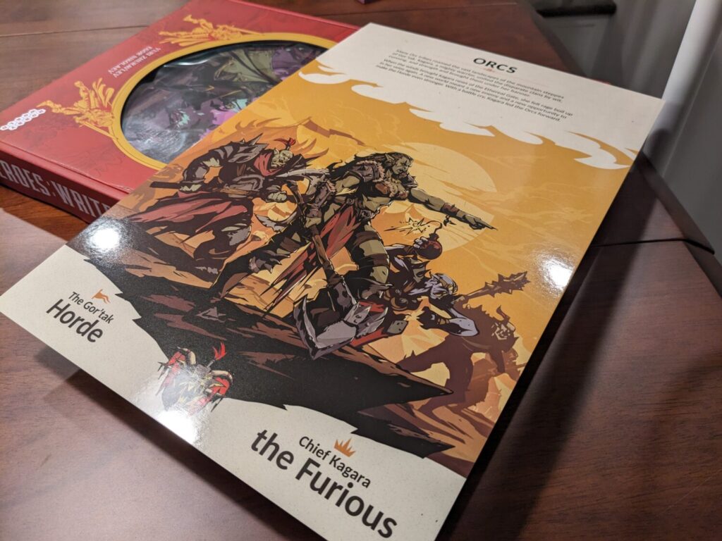 Sure, you’re thinking…the game is called “Write & Conquer”, not “Fight & Conquer”, so I get that some players will be totally fine without the combat. But I think more combat would have made for a more interesting experience. I do appreciate that there are six factions included here, because every faction has different buildings, and in one case, different resources. (Orcs can collect rage. Of course they can.)