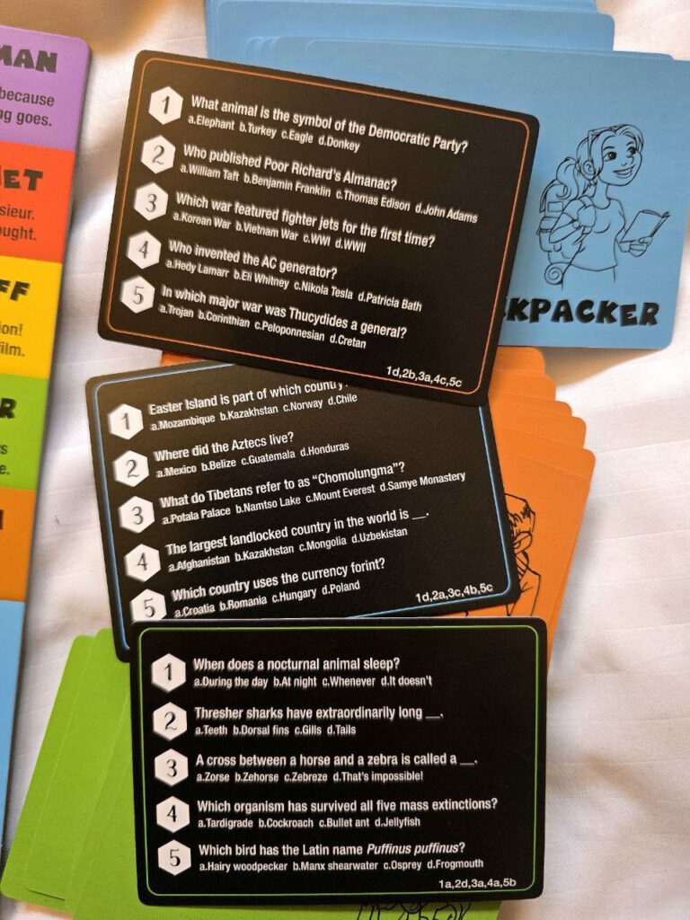 Overall, the game is solid. The push-your-luck strategic element adds a fun amount of risk and makes for plenty of position jockeying. With over 1,500 questions spread across 300 cards and six categories, there’s enough variety to keep the game fresh for numerous trivia nights.