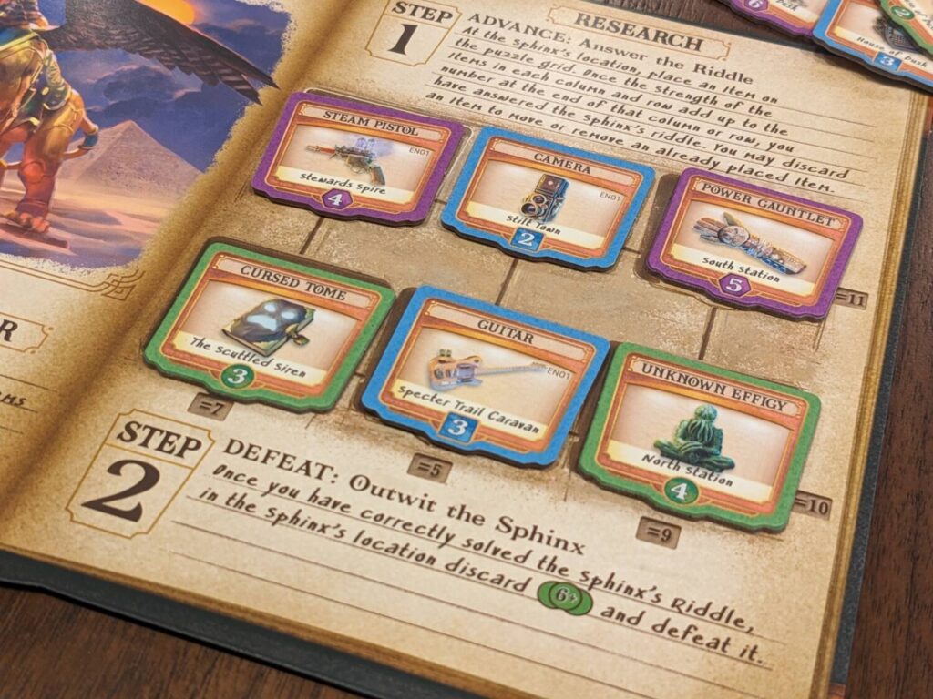 Here’s all you need to know about Cthulhu: the setup steps for the Sphinx, Yeti and Jiangshi take up like six lines of text in the rulebook. Cthulhu has its own rules section, with an elaborate (for this game) setup that includes a fancy toy model, a separate card used as a board, a bunch of “Manacle” tokens, and an almost ridiculous defeat condition—all players need to have a set of three different colored items and be in the same location.