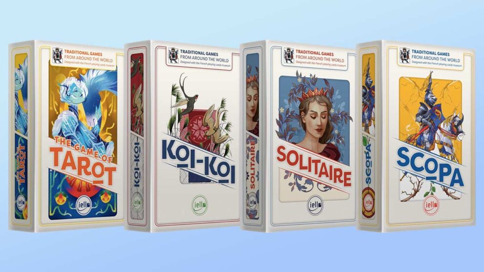 It comes as no surprise, then, that I am an easy mark for French publisher Iello’s new Traditional Games line, which is kicking things off with beautiful slipcase editions of French Tarot, scopa, solitaire, and koi-koi. Each comes with a set of beautifully-illustrated cards or tiles as well as a rulebook that includes a brief history of the game in question, a good explanation of the rules, and a list of popular variations in the back.