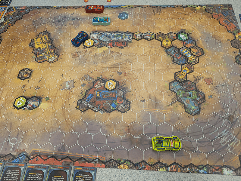 The unconventional approach is obvious at first glance: there’s no track. Instead, checkpoints are placed around large open play areas to create racing routes. The game includes pre-made layouts in a separate rulebook, but players can design their own if they want more control. Drivers navigate from checkpoint to checkpoint while grabbing combat items to either boost their own position or sabotage their rivals. Basically, this is Mario Kart having an awkward love affair with the fine sport of destruction derby.