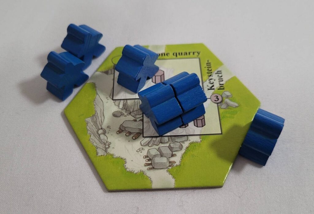 These tiles are activated by placing meeples on top of them. Some will outright produce a resource of a certain type or a collection of resources, while others require some kind of tradeoff. This, for example, might be trading a skill tile for several stone resources or trading a red meeple for a green meeple. Anything produced from a resource producing tile is stored on top of the tile which produced it (or your Home tile if you produced using another player’s tiles).