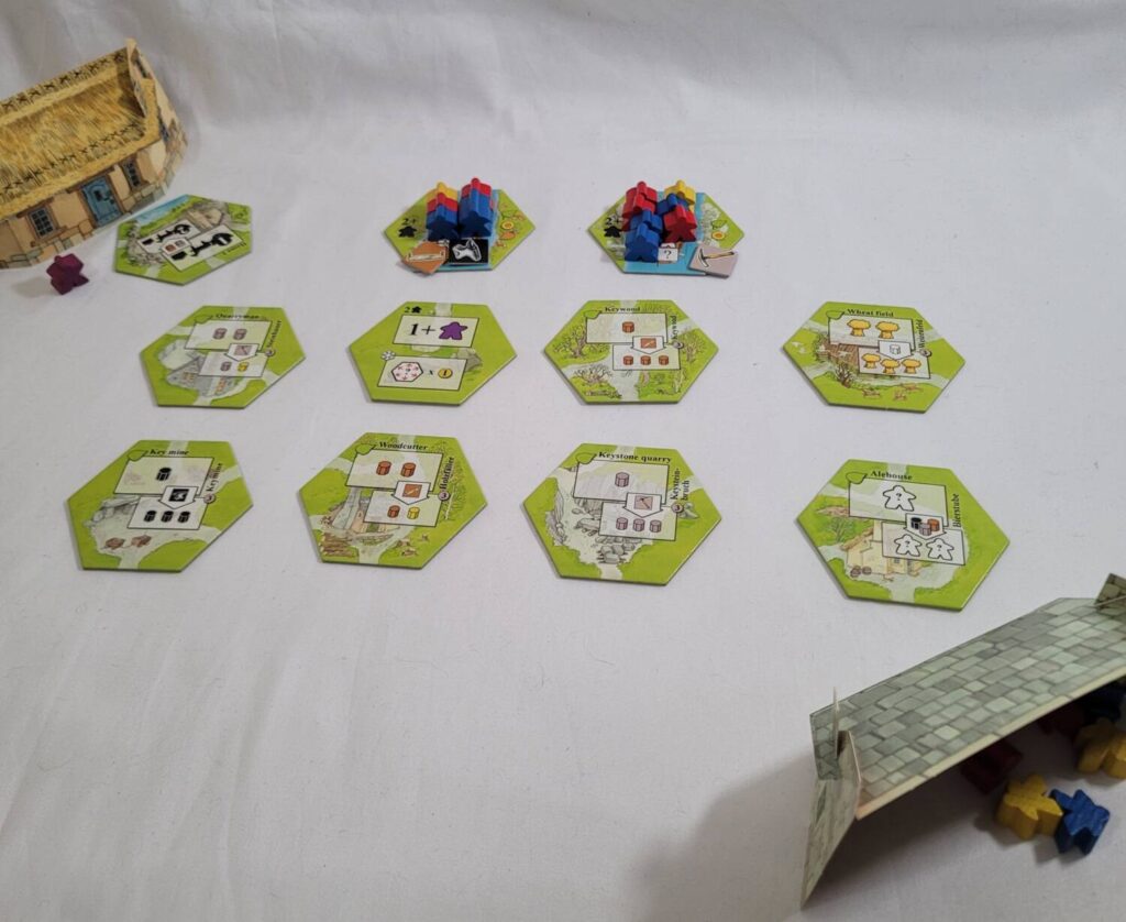 First, all the meeples (sans the green ones) are placed into the cloth bag and the bag is given a good shake. Then, all the resource counters are separated by type and set off to the side. Next, all the skill tiles are placed face down onto the table and then shuffled to ensure they are mixed well.