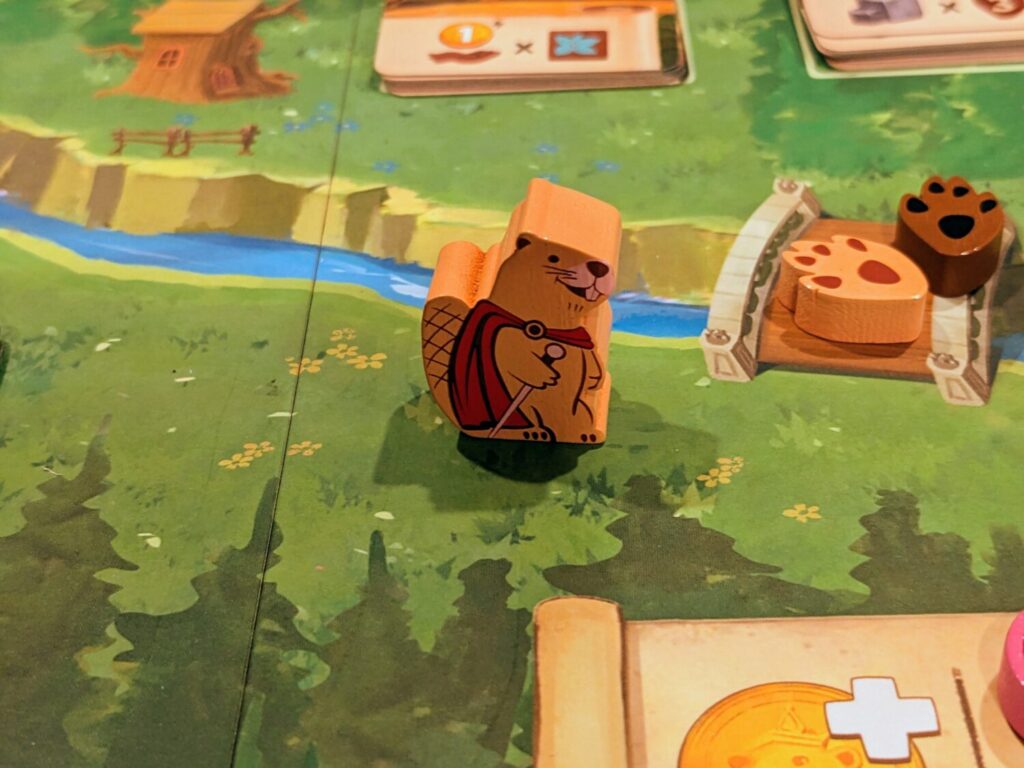 Movement is dictated by each player’s hand of six action tiles. In each round, four of these six will be played, to either move around the map or to “rest”, which triggers coin income from that tile so that players will have more to spend on future turns. Small paw tokens are left on each bridge as a player moves across each one, with points awarded to players who find a way to move across at least six, and hopefully all seven, bridges in a round.