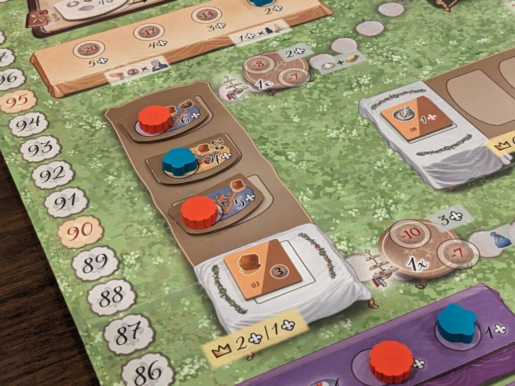 The ingredient tiles and the recipe tiles could use slightly larger icons, particularly ingredient tiles showing multiple ingredients. Sometimes, it is very difficult to tell if a tile is showing eggs and nuts, eggs and eggs, eggs and honeycomb, etc. Depending on your seat at the table in a larger player count game, expect some players to complain about these issues.