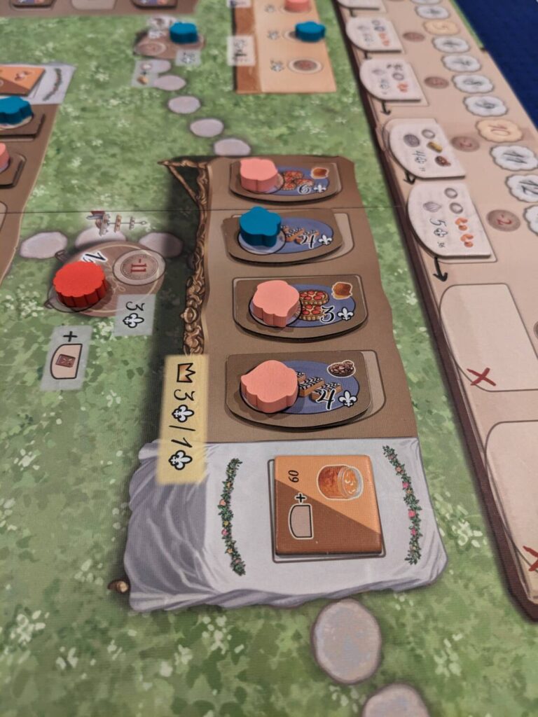 I had forgotten this until I went back and re-read the rules for the base game. Still, I like this change. I found in the base Rococo game that, occasionally, players might luck into having the right resources at the right time with the flop of new dresses in the warehouse to begin a round. This is another way where turn order was incredibly consequential, making the Queen’s Favor so valuable. Here, in La Pâtisserie Rococo? You can do a little more planning in the “recipe fulfillment” area of your strategy.