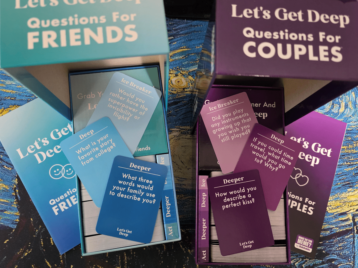 Each set comes with 300 cards. The cards are broken into Icebreakers, Deep, Deeper, and Activities. On a player’s turn, they draw and read a card from any of the four types. Then, each player answers the question, or performs the activity (including the player who drew and read the card). Each question gets more and more personal as you move from Icebreaker to Deeper; the activities are nothing that would cause any concern, as they are things like seeing who is ambidextrous by having each player attempt to write their name with their off hand, and the like.