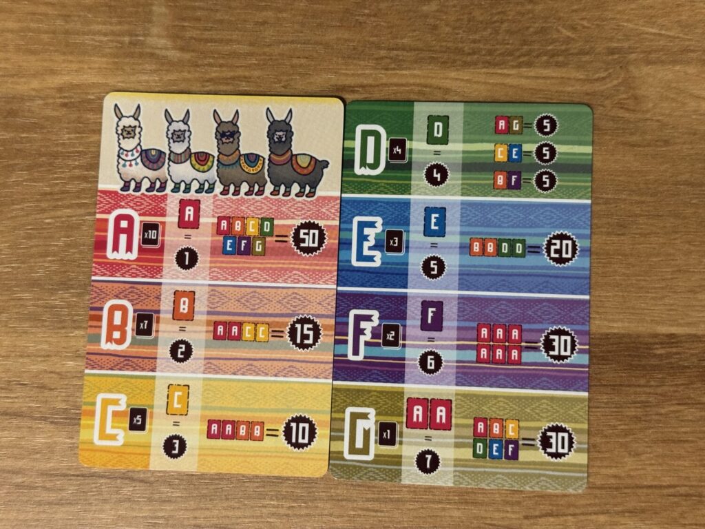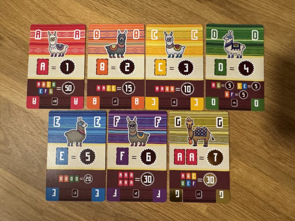 All llamas are not created equal. Every card is labeled with a letter A-G, worth an increasing number of points as you progress through the alphabet. Additionally, each letter has its own scoring condition. For example, if one of the Goal cards is an A, then all A cards in your final hand score 1 point, plus if your assembled hand contains every letter A-G you score an additional 50 points. B cards are worth 2 points, with additional points if your final hand contains two As and two Cs.