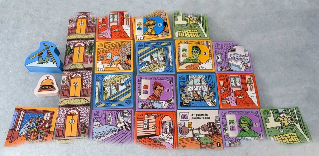 Before I talk more about the gameplay, I’d like to gush about the artwork. Illustrator Leslie Herman has done a masterful job of putting a unique face on Lodge. The cover, the room tiles, and especially the guests give this game a Wes Anderson feel (beautiful when viewed from a distance, but slightly manic and off-kilter up close). My game group and I had a fun time trying to compare guest’s faces with Hollywood celebrities (who we’re positive were the influences behind the characters). We found Andy Samberg, Bill Murray, Steve Buscemi, Ellen Barkin, and Andrew the Giant. Who do you see?