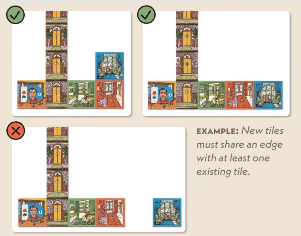 - You must have one unoccupied and adjacent room of each color shown on the guest token. If your token shows red and blue icons, then you must have an empty red and blue room right next to each other (not diagonally).