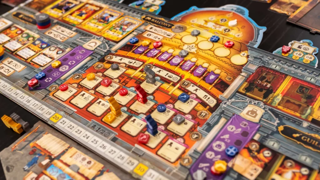 There’s also the added wrinkle of tiers. Nearly every action (Repair, Guild, Salon, Perform) has two cards that can be claimed at no additional cost (tier one) and two that escalate in cost (tiers two and three). This adds even more importance to turn order and strength, and it’s easy to get hosed and left with pricey options. Players can unlock the higher tiers (meaning no extra cost), but that requires advancing up a balcony track.