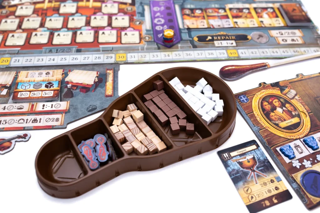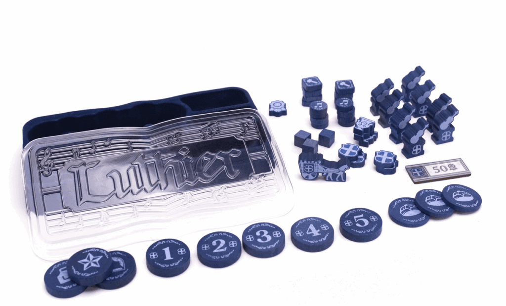Luthier sends players to the classical era of Europe, working to court patrons with masterfully crafted instruments and performing various repertoires of music. Over six rounds, players bid their workers around different action locations—gaining, building, or repairing instruments; wooing patrons; performing; or trading at the market all while racing to claim first-chair positions in the grand orchestra.
