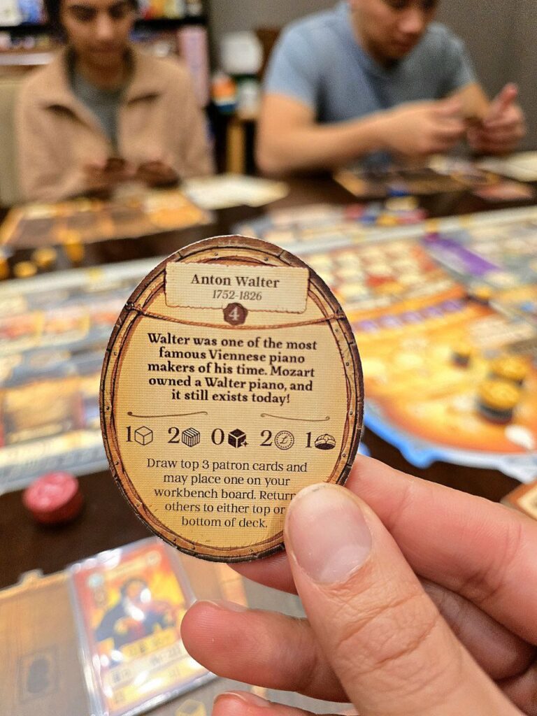 Patrons come in a variety of flavors and require certain types of instruments to be built or specific kinds of music to be performed to gain their patronage. However, idle too long, and the impatient patron will leave to pursue someone else, resulting in negative points. While the patron occupies a player’s workbench (board), gifts will be showered each round in the form of money or resources until they’re completed or timed out.