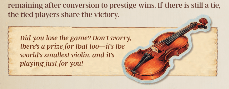 Players score for the number of first chairs they occupy, summing up the area-majority game. Built instruments always take the first-chair position, but if none are present, the chair is decided by the majority holder of repair and performance tokens. Add in private objectives, leftover resources, and remaining finished instruments, and that’s the show, folks!