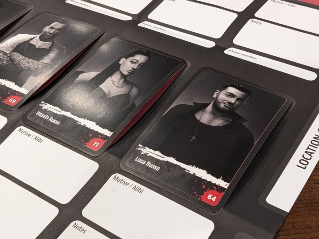 One thing Vendetta gets wrong—the “Detective Board” players use to keep clues, location cards, suspect profiles, and other notes organized. It’s a simple piece of paper that feels cheap and looks shoddy when placed on the table. I get it: Vendetta is a one-shot game where you are writing on some components, making it a little harder to gift to a neighbor without some advance planning. Still, we both thought this production element stood out, but in a negative way.