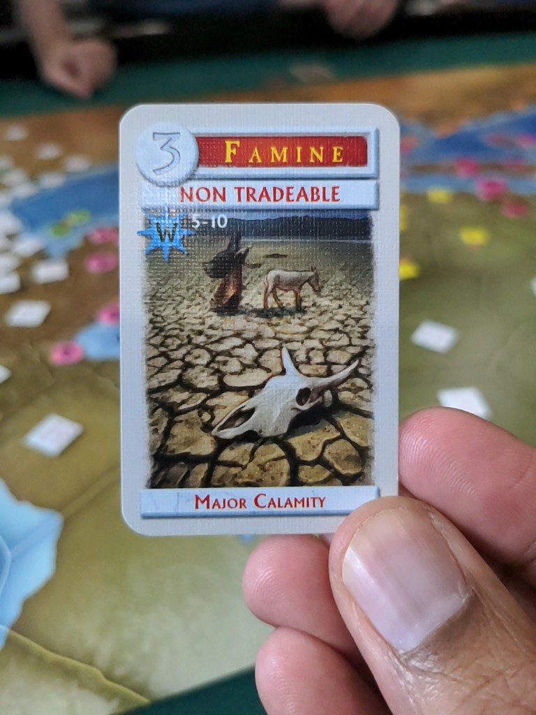 My first play of Mega Civilization was rough, friends. I spent most of my rounds in that game building back from two cities to get up to five cities, only to have a calamity knock out two or three of those same cities. Every time there was a non-tradable calamity in play, it seemed like I was dealt that card. I got victimized regularly during play by opponents—both in conflicts and in the trading game—and never built a level three advancement. I was involved in a conflict every round after play really kicked into gear.