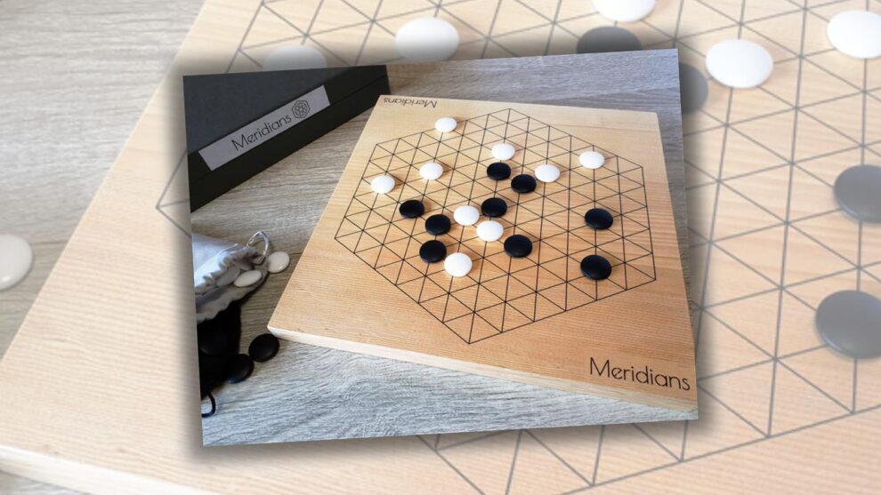 Meridians is likely his best-known game. Over on BoardGameGeek, Meridians was awarded the Best Combinatorial 2-Player Game of 2021. It’s a game of area control and capture where each of your pieces needs to be connected by line-of-sight to at least one other of your pieces. If not, that piece—or group of such pieces—is eliminated from the board. When all the territory on the board has been claimed, the player with the majority wins the game.