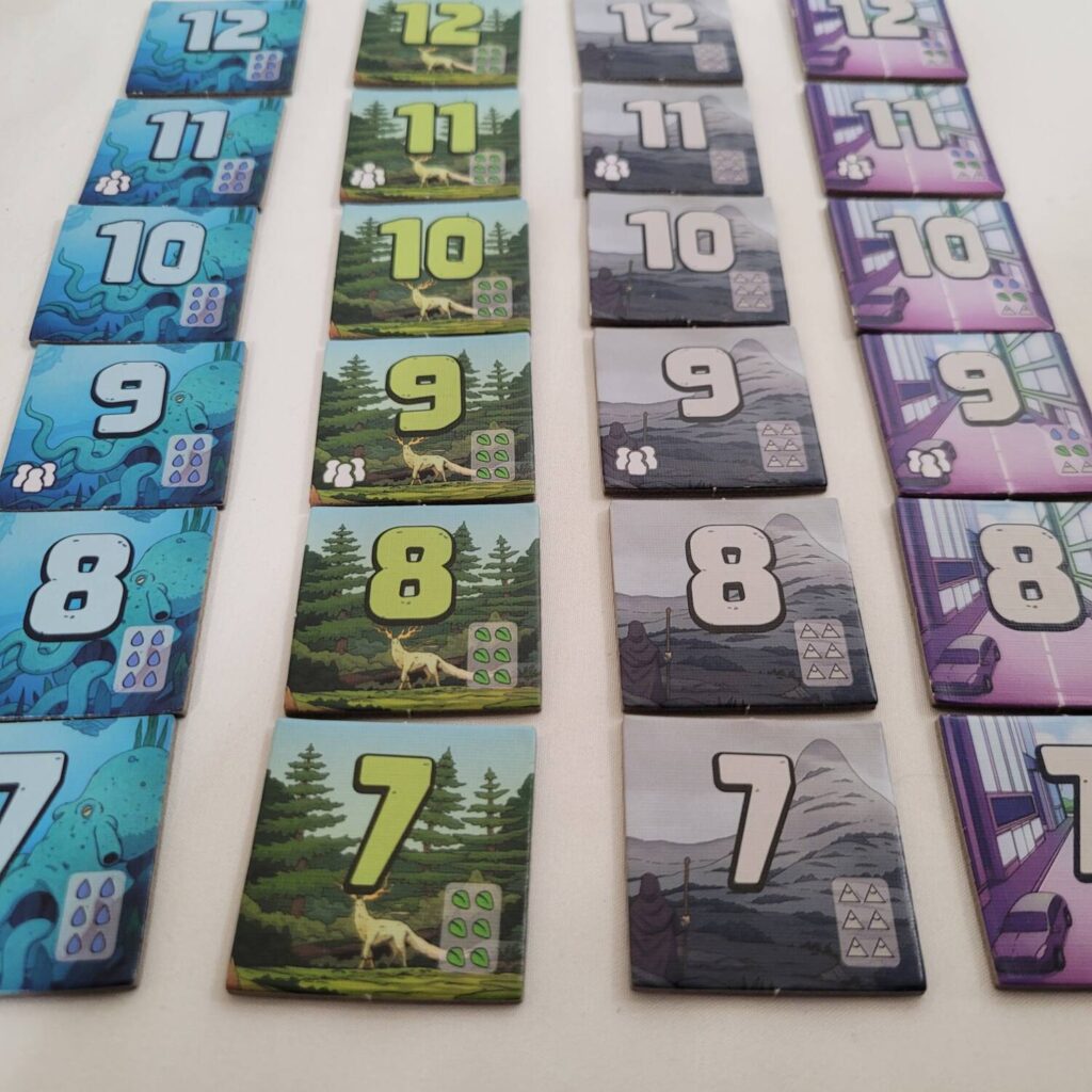 There are four types of Region tiles in the game—forest, sea, mountain, and city—and each tile costs a total of six Influence tokens to purchase. Forests cost six green Influence tokens. Seas and Mountains cost six blue and grey tokens, respectively. The city tiles cost two of each. At the end of a player’s turn, they will have the opportunity to pay the requisite tokens to collect the highest valued Region tile from its stack and add it to their personal area to be scored at the end of the game.