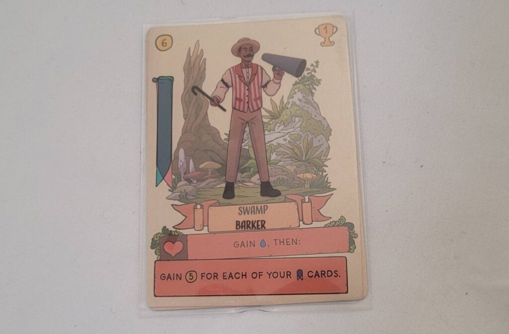 Swamp Barker – Cost 6, VP1, Type = Misfit. Heart: Gain 1 water influence, then gain 5 coins for each of your Misfit cards