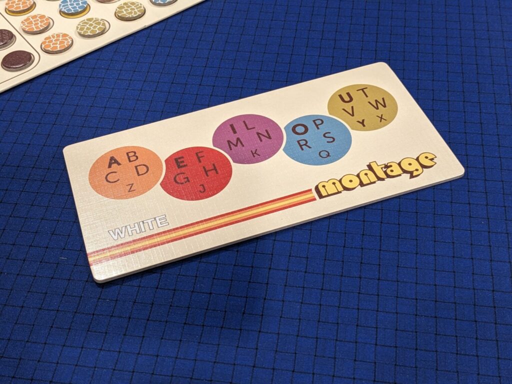 The creativity is on display everywhere in Montage. My favorite part of the design is the first question Meeple Mountain contributor Joseph Buszek asked during the teach. “What’s to stop anyone from just, you know, making up an answer that fits the space where the active word is going to be given? I see one red disc on the table in that word space, in the third letter position…couldn’t I just say that F-R-E-S-H is the answer, since E is part of the red chit’s letter set?”