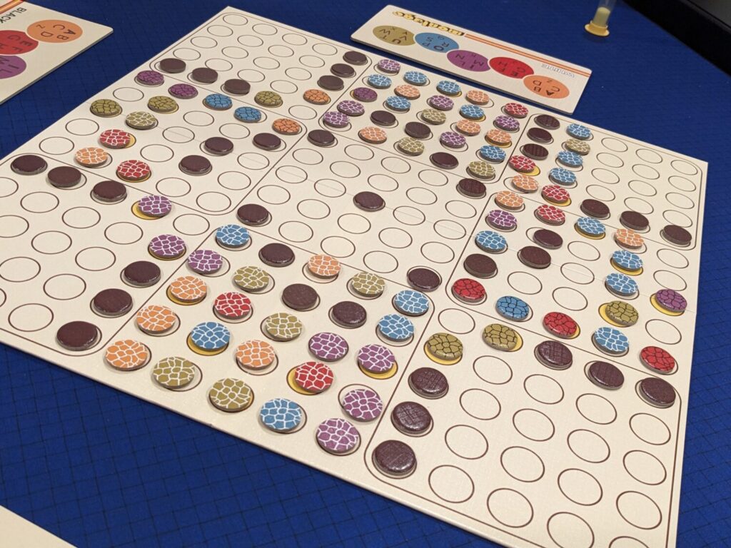 Each of the five disc colors can serve as up to six specific letters. Orange represents A, B, C, D, and…Z. (I know, but bear with me.) Purple is I, L, M, N, and/or K. In a zone, these discs are seeded so that the active player, known as the “Quizzer”, can formulate words using at least one disc in that word to give a clue to their partner. Also within each zone, those dark tan pips represent blacked-out spaces, sort of like the solid black squares in a crossword puzzle.