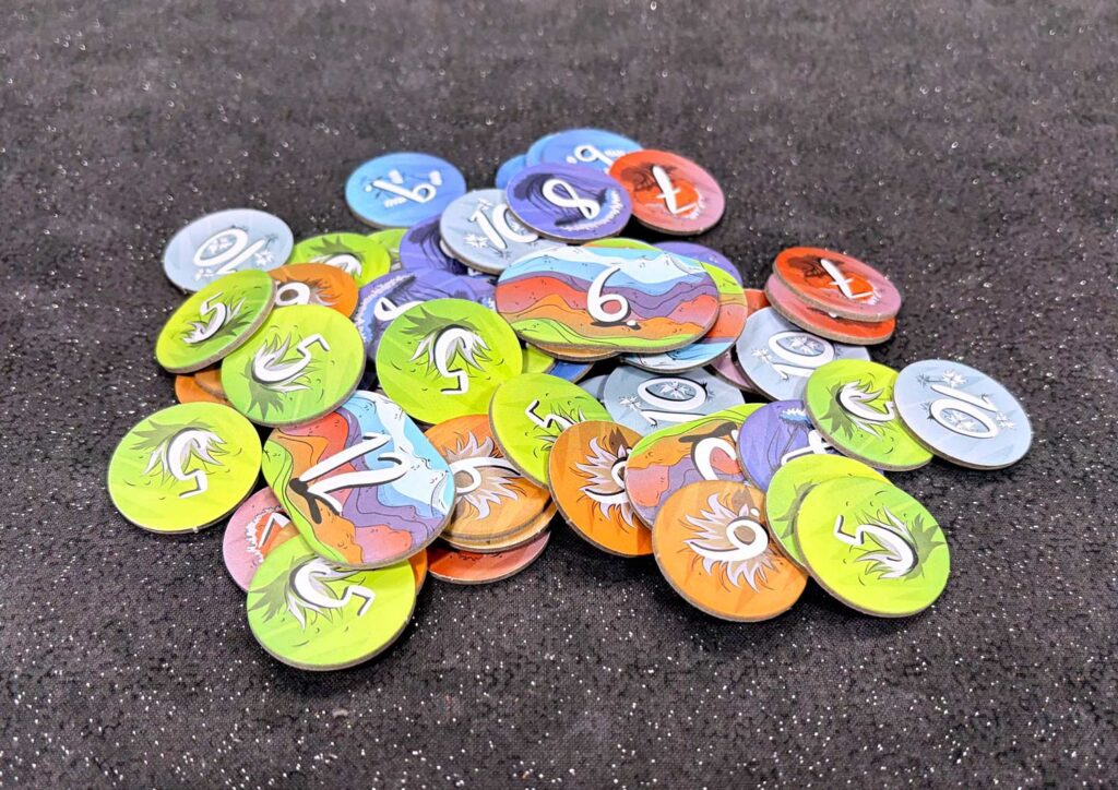 Play continues until either all the bonus tokens are gone, or all point tokens from 3 different mountains have been claimed. Add up your points and crown the king of the mountain.