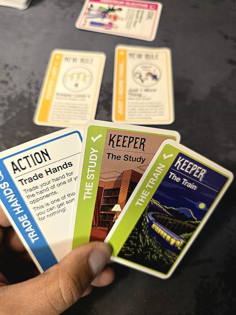 Within the first turn, there is likely no winning condition, and players follow the simple, draw one card/play one card turn. Over time, the game state changes where players need to play “keeper” cards in front of them, in hopes that they have the right combination that matches a player’s “goal” card. Within the deck are rule cards that change the draw/play/keeper limits, along with “surprise” cards that can instantly cancel other cards.