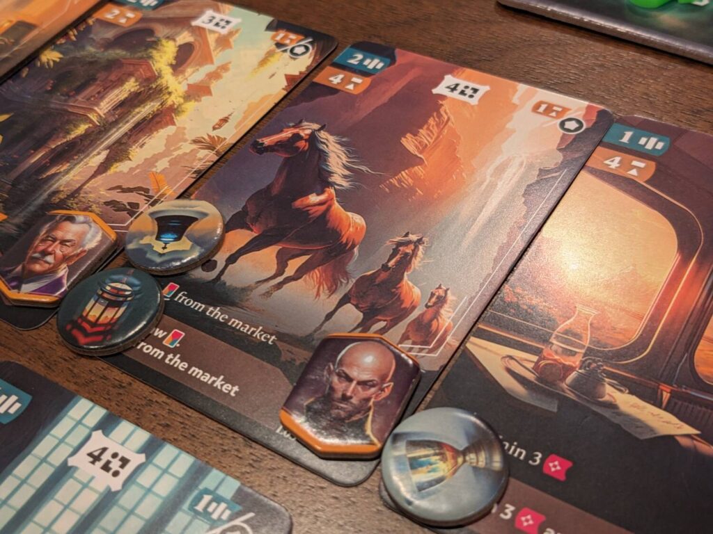 I taught Neodreams to players in about five minutes, so the rules load is light even for someone newer to games. Turns are fast, and games last just as long as the box says they should, or about 30 minutes for two players, maybe 45 minutes for four players. The cards look good—every single adult player thought the art looked like AI art. Even though I know that was not true, I was surprised how consistently this comment popped up. Much like Furnace and Smartphone Inc., Neodreams feels like a luxury product for a value price, with sharp worker tokens and a card finish that shines in all the right ways.