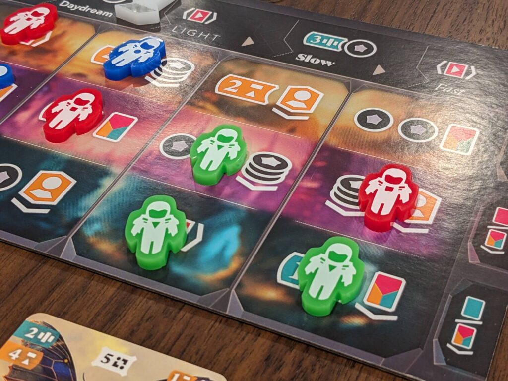Ha, yes, sorry…I did. You see, Neodreams is a fairly heads-down affair as players race to build cards, with powers that only they can see well enough to warrant interaction with anyone else at the table. And any time someone said something in our review crew play of Neodreams, players seemed genuinely surprised. Mostly, players will be talking to themselves as they fire their Neodream engine, or when they place a Client token on a Lucid card to grant a big boost of one of the game’s resources.