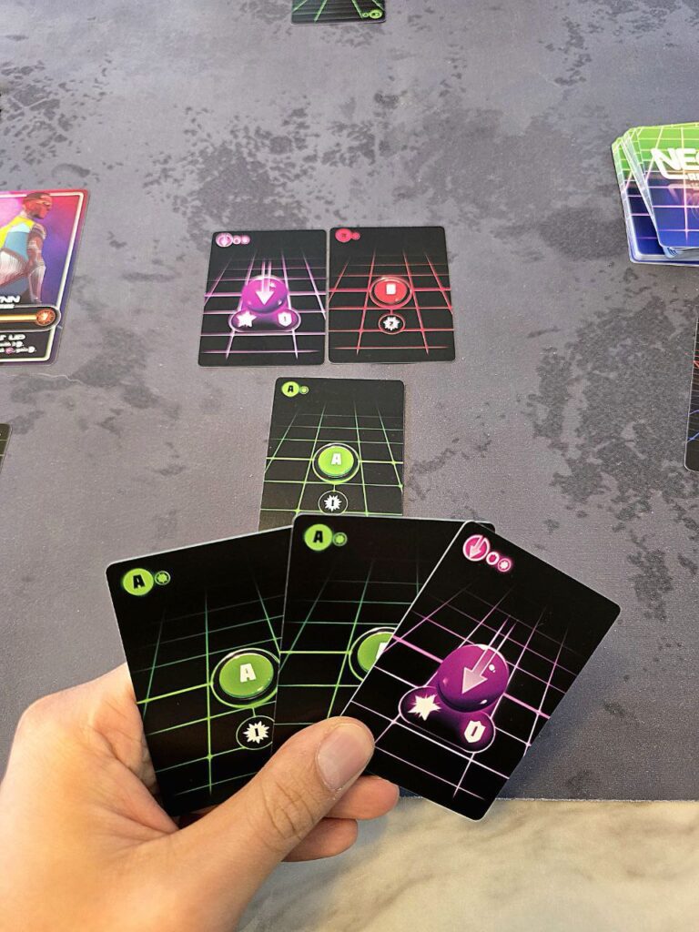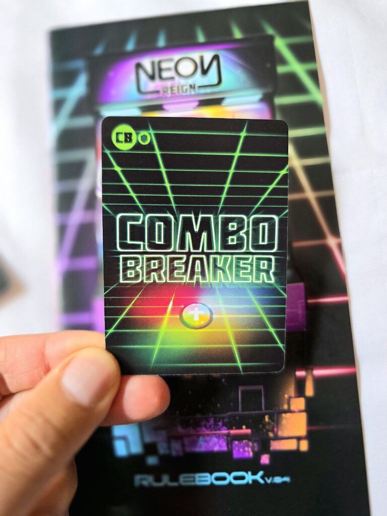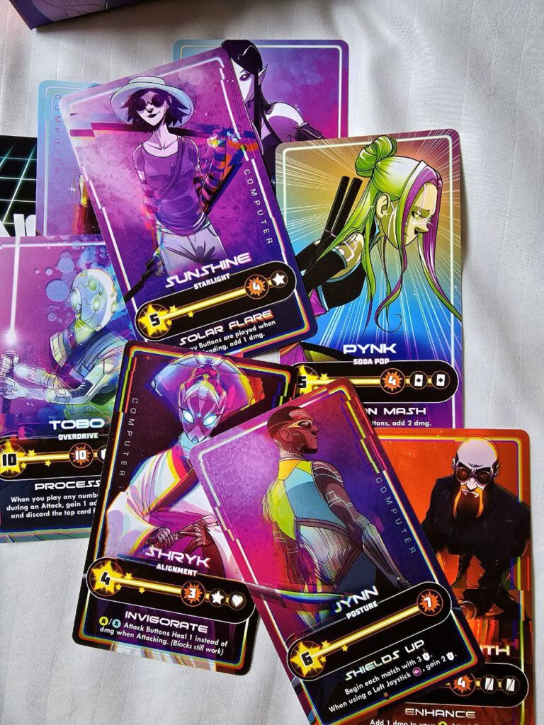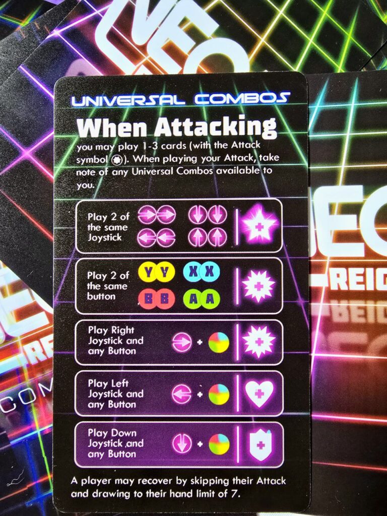 Neon Reign plays until one player loses all their health and gets KO’d. A match can also end in a tie if both players power up their “special” at the same time, leading to a dramatic double KO. Players start with a hand of seven cards and can play between one and three to form an attack combo.