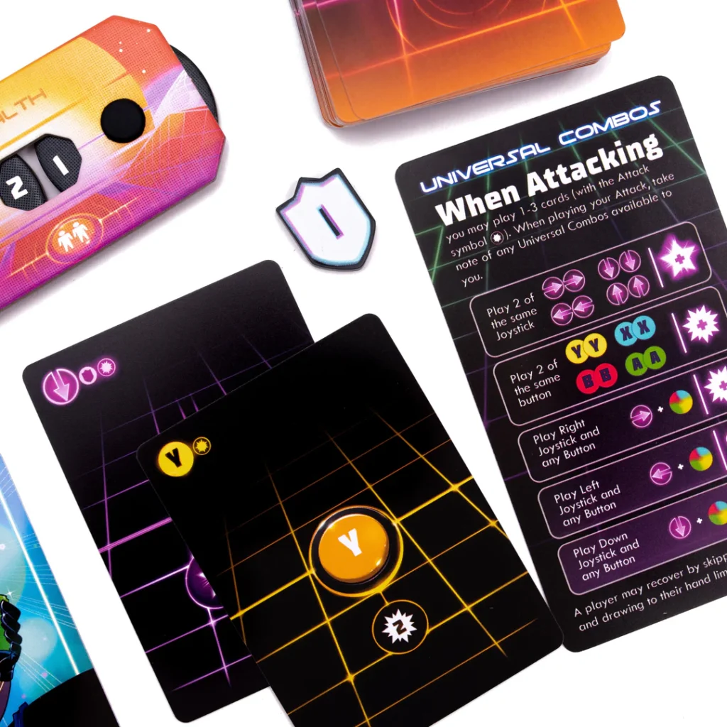 Joystick cards indicate a direction and often generate stars (used to fuel special attacks), heal damage, or cause discards. Button cards (in the classic X, B, A, Y variety) dish out straight damage. The magic of the game comes from the way you combine the joystick and button cards together. Don’t worry—there’s no need to memorize combos or scrawl them on an index card like I did back in the day. The player aid handily outlines the possible combos that grant extra damage, healing, or consumable shields.