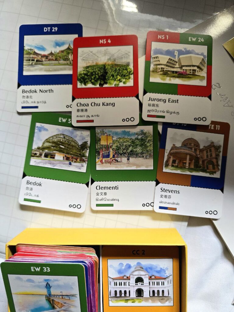 Next Station: The Singapore MRT Game is a light-hearted card game centered around the six MRT lines. Note: This game isn’t related to the Next Station: Paris or Next Station: Tokyo family of games, even though it shares the same title. While other train-themed games—such as Free Ride, Age of Rail: South Africa, On the Underground: London/Berlin, and Ticket to Ride: Legacy of the West—focus on rail-building, this game is more about color (line) matching, similar to Uno. It also includes two additional ways to play: a two-player-only speed game and a trivia mode. The box includes two copies of the MRT system map, helping familiarize players who may not be everyday riders.