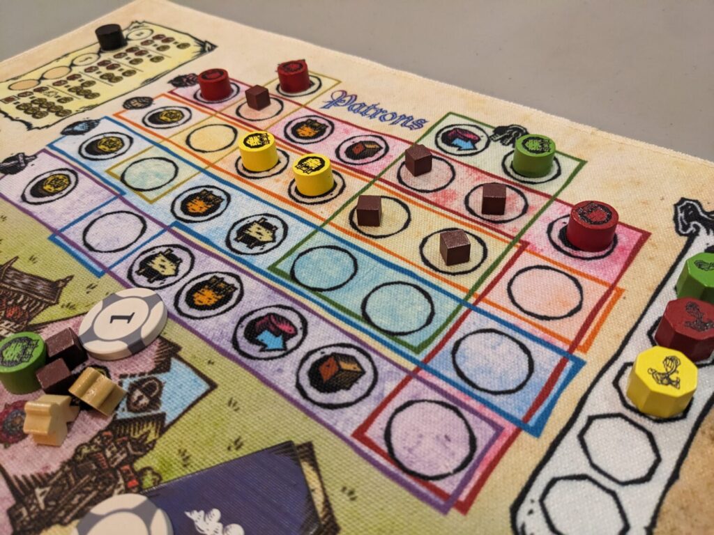 Night Soil elevates itself above the fray in many different ways. The game comes with a cloth board, which somehow made my experiences with the title more elegant. The influence tracks at the top of the board are non-linear, with some tracks crossing over into other tracks. This means that a player who wants to influence the Lamplighters might also be able to influence owners of local breweries. During play, certain actions allow a player to place influence tokens on these tracks, and the current majority leader earns a special power that is theirs as long as they maintain a strict majority.