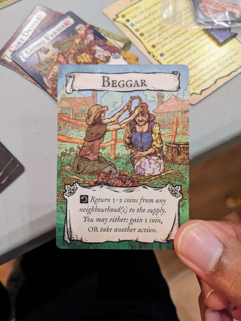 And this is where Night Soil really shines, during that Night phase. That’s because players don’t have their own workers to use during the Day phase. They have to earn them by cleaning out neighborhoods where workers were placed during the Day phase. Keeping those neighborhoods clean long enough to take workers (and sometimes, coins) into their possession is critical because if you don’t have any workers, you can’t take any turns during the following Day phase.