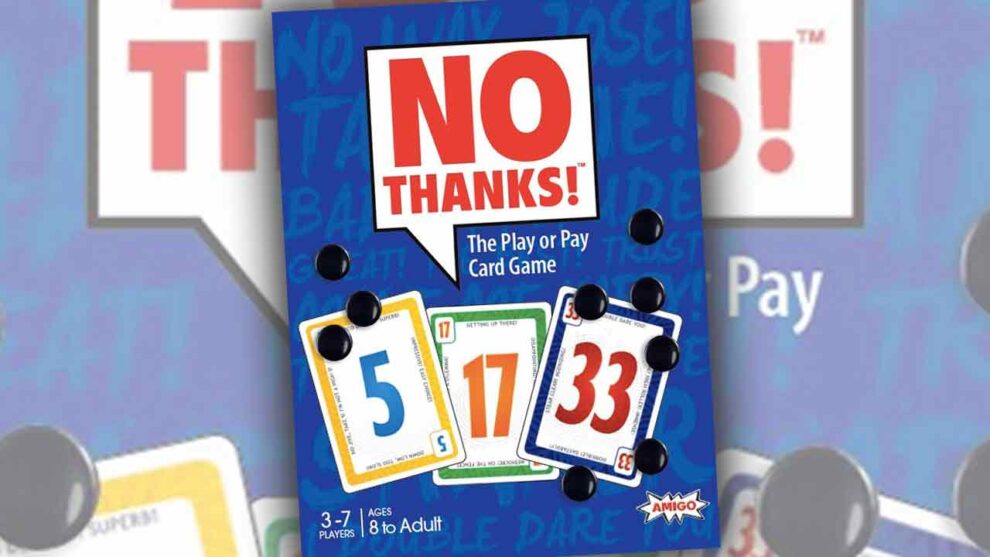 No Thanks comes with a deck of 33 cards numbered 3 to 35, and 55 playing chips.