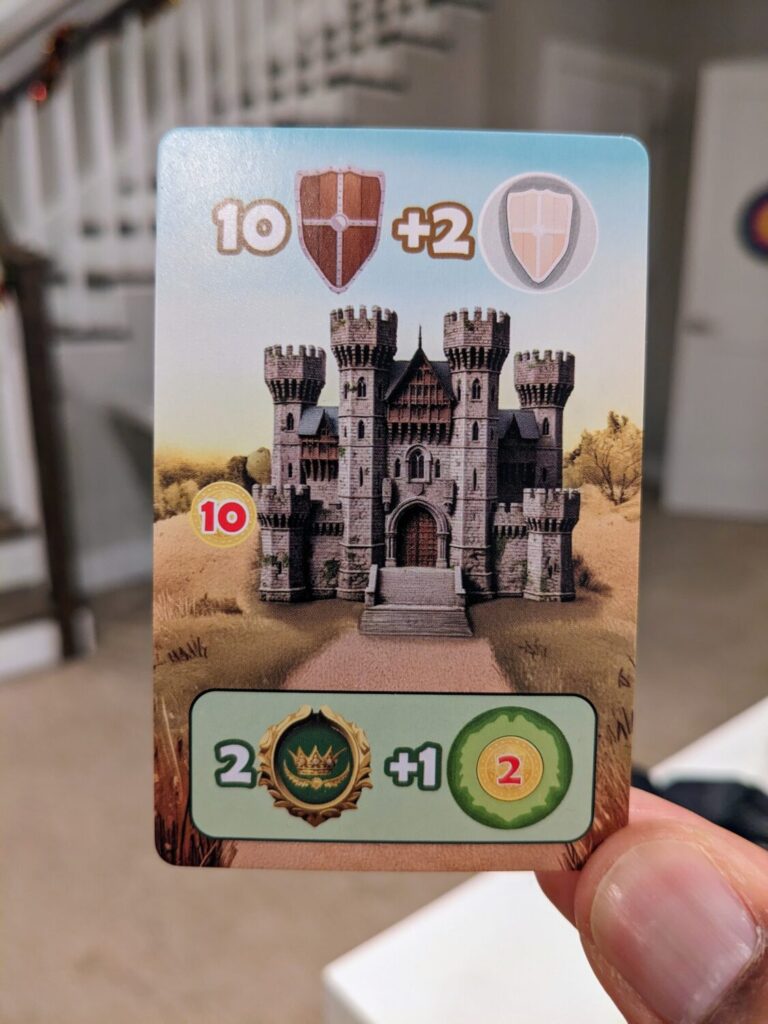 In a separate area outside of the market, there are sometimes castles available for purchase, used to boost the shield value of a row but to also add scoring potential to the row with prestige points. When combined with the meeple spaces showing on each building card, a row will score positive points as long as the shields outpace the helmets.