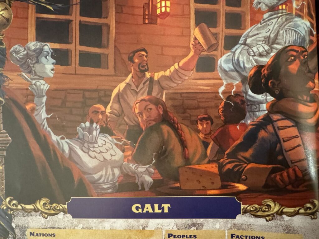 I’ve always been a firm believer that a map can tell you a lot about a particular city and culture based on its structures, proximity to landmarks, and building density. Even though each nation gets two maps—one for the nation and another for their capital city—they provide invaluable insights into ways that a Gamemaster can approach and detail those areas. Every numbered map location in the key is accompanied by several paragraphs providing context as to why it’s worth pointing out. For example, the map of Isarn—Galt’s capital—shows the major roads all leading inward to the city center where the Hall of Justice looms over the Revolutionary Plaza. This detail places emphasis on the tumultuous past with the Grey Gardeners rounded up dissenters and subjecting them to the magical guillotines known as the final blades in a public spectacle. Maps tell plenty of stories on their own, but I appreciate the additional explanations provided in the book.