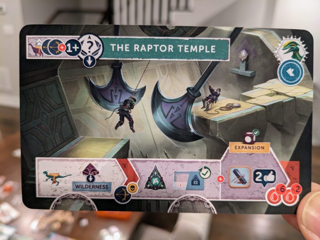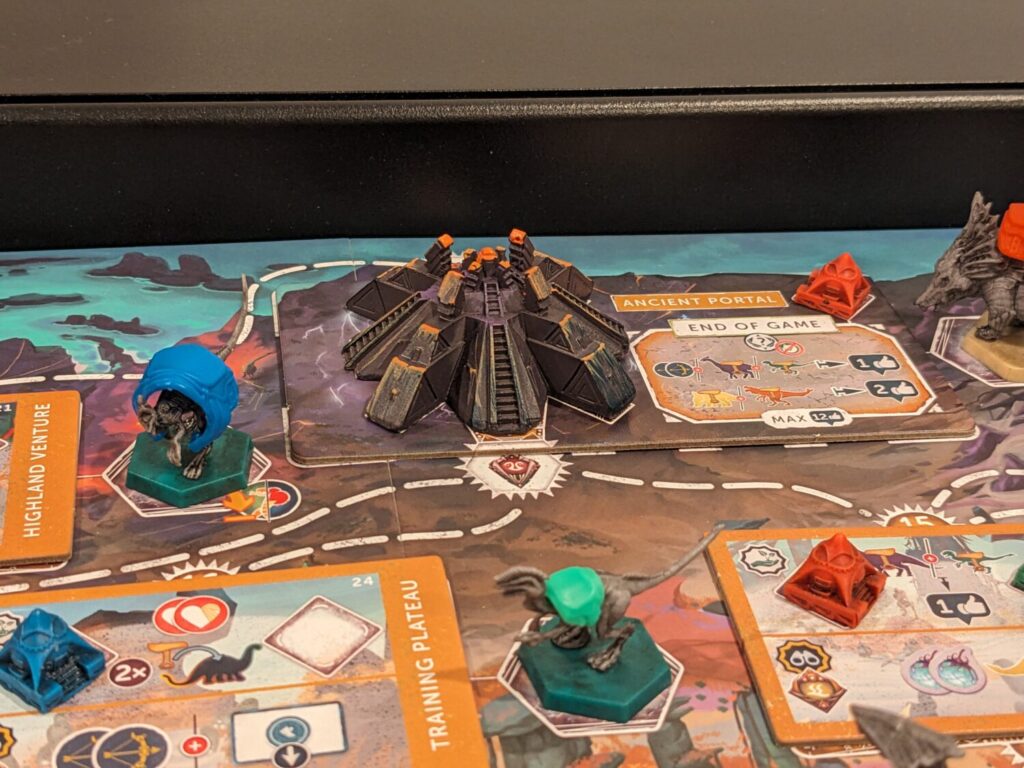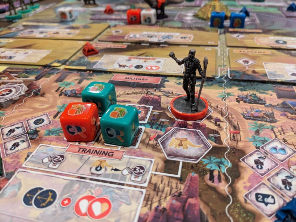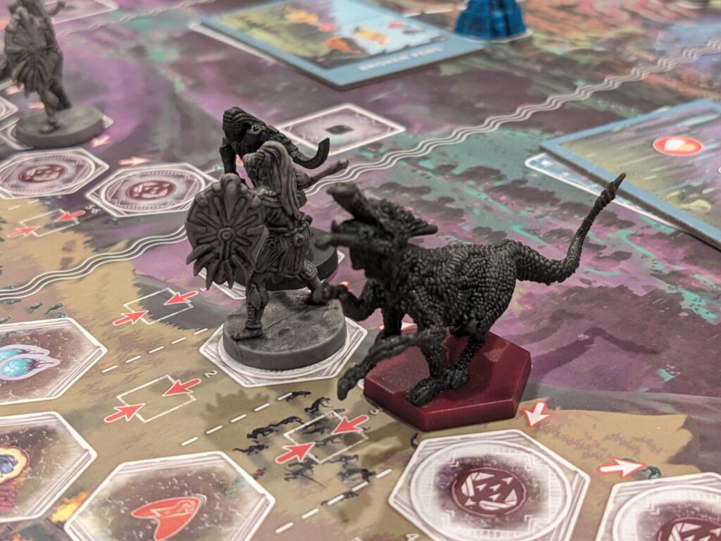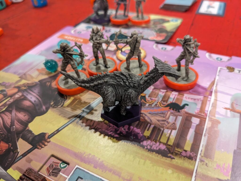 The wilderness also includes three temples that can be explored, represented by some of the greatest minis Mindclash has ever given us. One of the temples, the Thunderhorn Temple, is a big ol’ eyeball. I loved it. Exploring temples is as simple as having the required number of troops and dinos to check out those spaces, and they come with handsome rewards. The temples also unlock other artifacts used for end-game scoring.